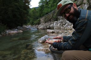 Amanda and Daniel are from Puerto Rico and regularly flyfish for saltwater fish. They return to the states twice a year to flyfish for trout. This time they came to Slovenia to try flyfishing here too. I was delighted to welcome them and guide them on two Slovenian rivers. The first day we were on the Sava Bohinjka River. It wasn’t exactly perfect and according to my expectations because we started in the afternoon and the fish weren’t as active and had already seen a lot of flies. However, they both caught a couple of nice rainbow trout.